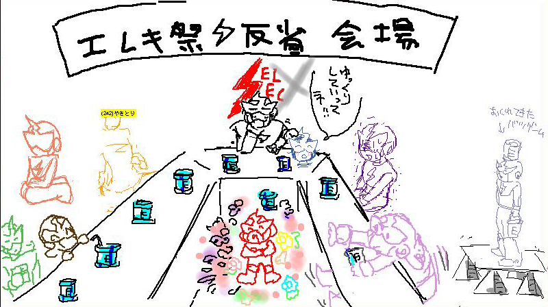あと前にエレキ祭り完遂した時にひらいた、エレキ祭り反省会の絵をのせときます!正直語りばっかだったんで絵が少ないよ!俺がキャプってないだけか!!^^